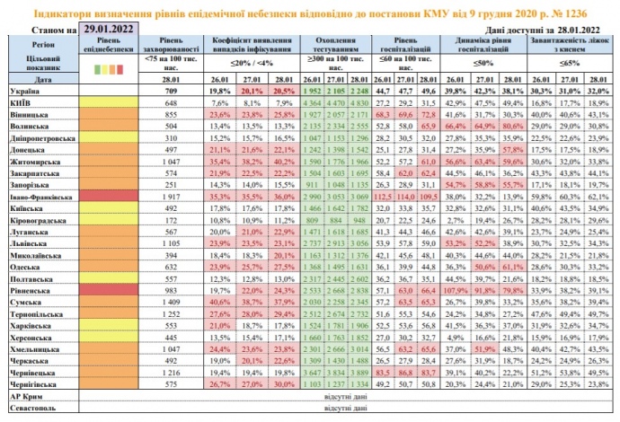 Станом на 29 січня, МОЗ відносить дві області України до червоного рівня епідемічної небезпеки і 16 – до помаранчевого.