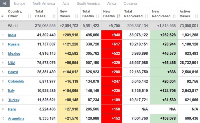 Найбільше смертей за добу від коронавірусу в Індії (940), Росії (617), Мексиці (522). Загалом у світі за добу від недуги померли 5 755 осіб.
