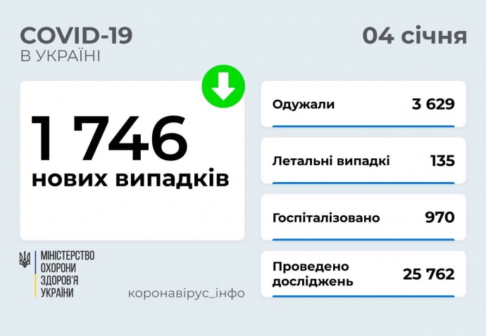 За добу 3 січня в Україні зафіксували 1 746 випадків захворювання на Covid-19, померли 135 хворих, госпіталізували 970 пацієнтів.