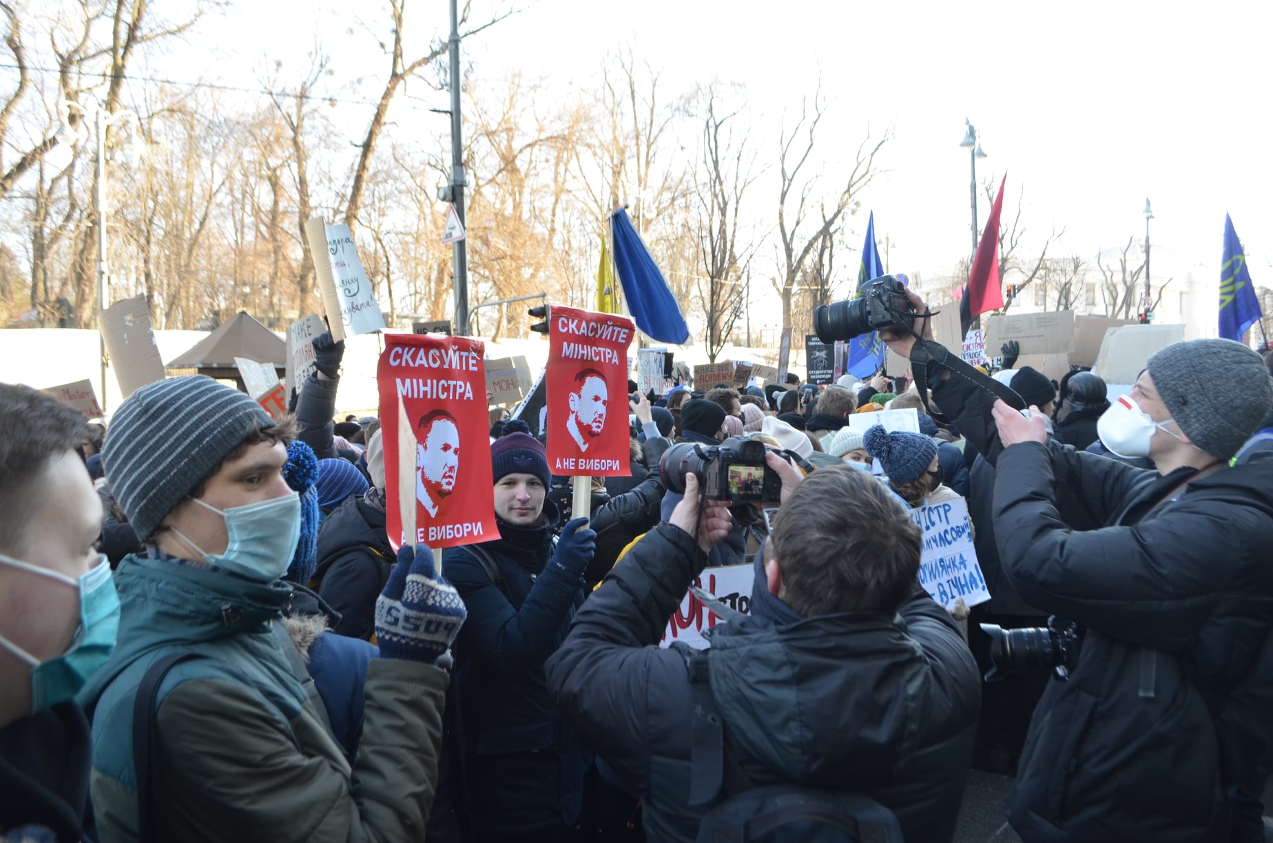 Вранці 4 лютого біля будівлі Кабміну студенти Національного університету "Києво-Могилянська академія" вимагають відставки міністра освіти і науки Сергія Шкарлета через скандальну ситуацію з виборами президента вишу.