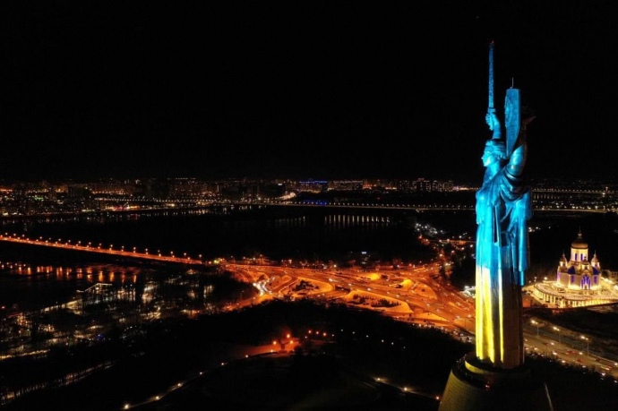 Батьківщину-мати підсвітили кольорами державного прапору на знак єднання нації, задля захисту української землі.