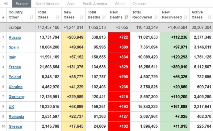 10 лютого у світі діагностували 2 316 136 нових випадків захворювання на коронавірус. За добовою смертністю від коронавірусу в Європі лідирують Росія, Іспанія, Італія, Україна – 6-а в цьому списку.