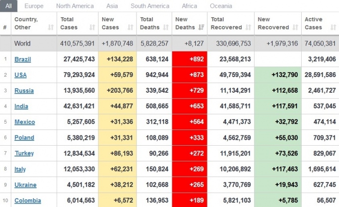 За весь час пандемії вилікувались від недуги 330 924 321 особа. Наразі нараховується майже 74 млн активних випадків захворювання.