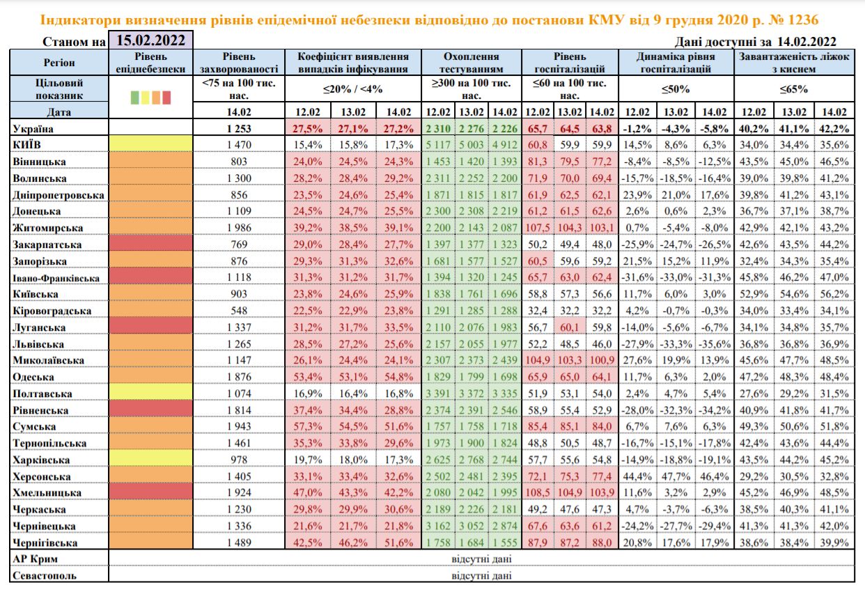 В Україні три регіони віднесено до жовтого рівня епідемічної небезпеки, п’ять регіонів – до червоного, решта областей – до помаранчевого.