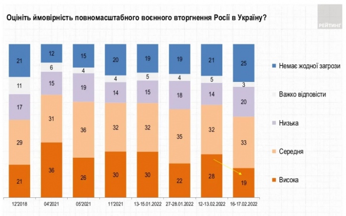 Таким чином, за останні кілька днів оцінка ймовірності загрози як високої зменшилась з 28 до 19%. Водночас, з 58 до 64% зросла впевненість громадян, що Україна зможе відбити напад, якщо вторгнення Росії відбудеться, вказують автори досліження.
