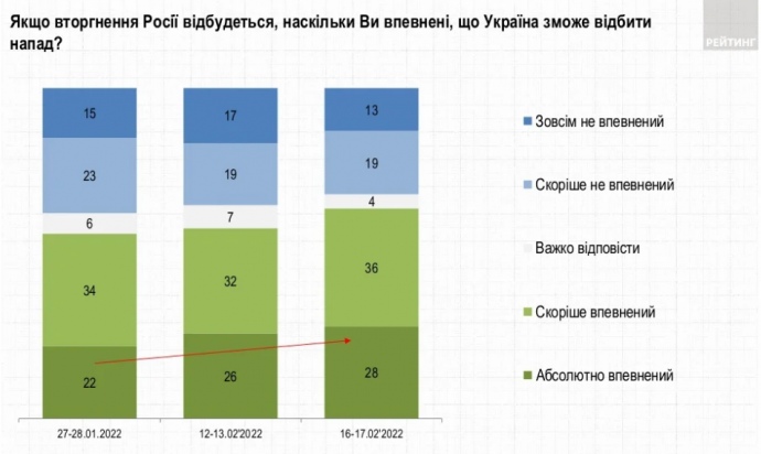За останні дні зменшилася кількість українців, які вважають високою ймовірність повномасштабного вторгнення Росії, водночас зросла кількість тих, хто вірить, що Україна зможе відбити напад.