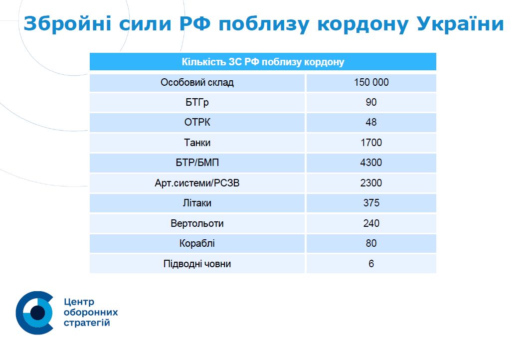 Порівнюючи спроможності та наявні ресурси ударних угрупувань РФ біля кордонів України з потенціалом України щодо всеохоплюючої оборони на чолі із Збройними Силами, експерти ЦОС вважають реалізацію РФ сценарію "повномасштабного вторгнення" малоймовірною.