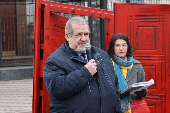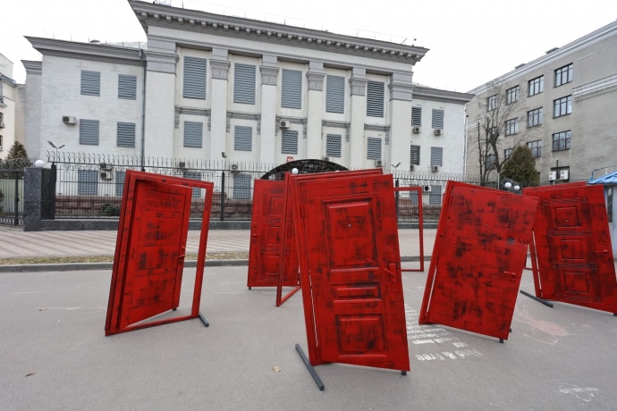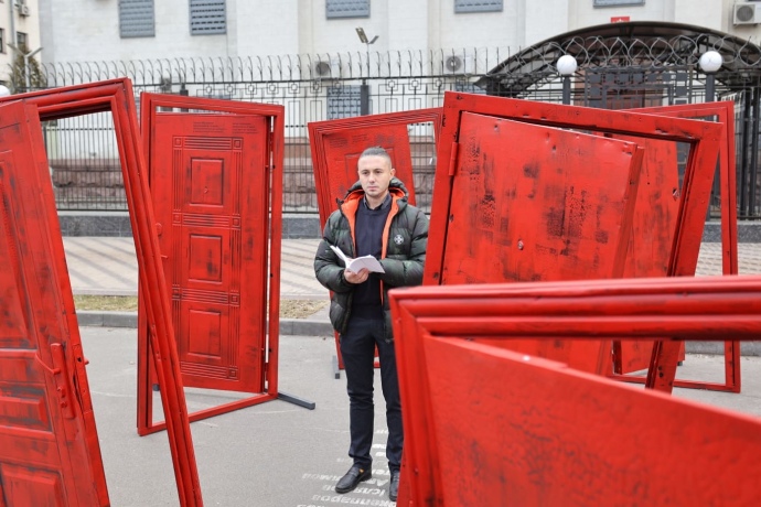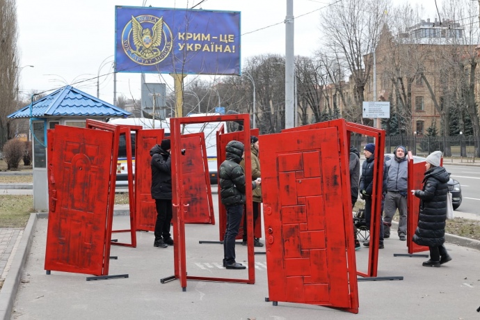 Деталі: Перед посольством Російської Федерації у Києві встановили 11 зламаних дверей — як символ 11 зламаних життів громадянських журналістів, кримських татар.