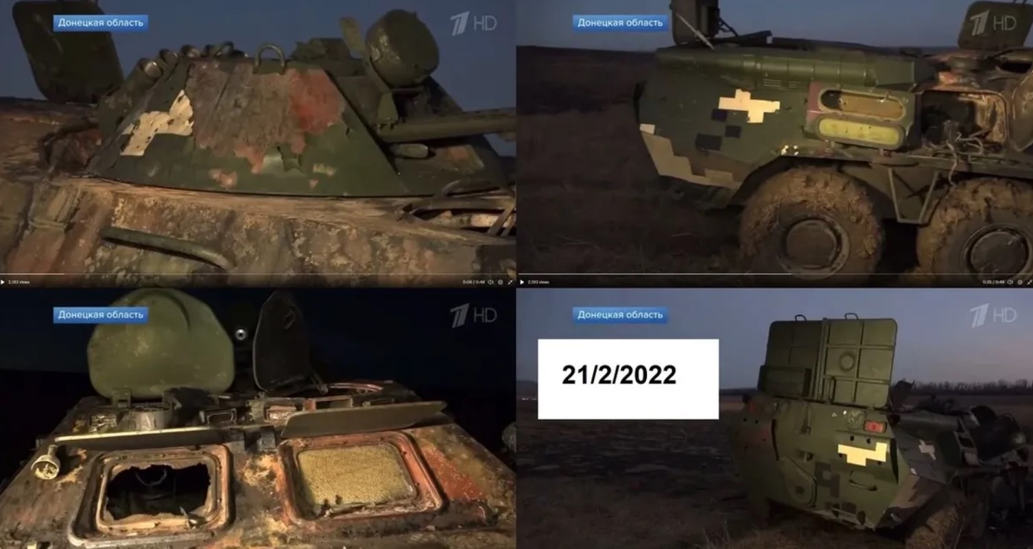 Російський "Перший канал" показав кадри з місця нібито знищення російськими військовими "українського" бронетранспортера. Однак виявилося, що це російська модифікація БТР, а на озброєнні України таких машин немає.