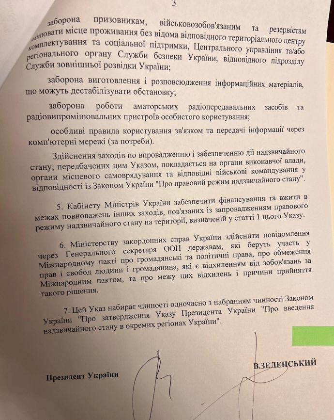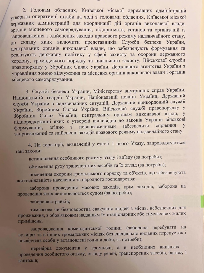 Надзвичайний стан запроваджується з 0 годин 24 лютого терміном на 30 днів на всій території України, крім Донецької та Луганської областей, де вже і так діє надзвичайний правовий режим.
