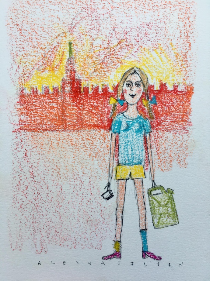Україна в образі дівчини з каністрою бензину на тлі палаючого Кремля: