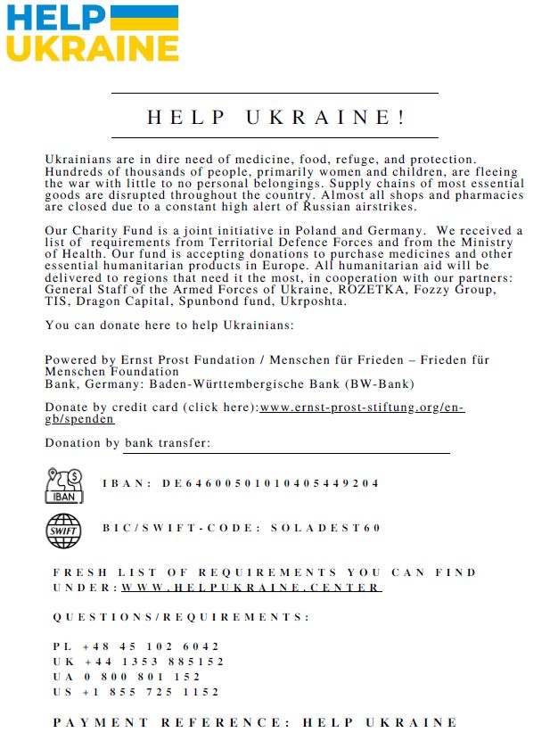 Деталі: Якщо ви фізособа – сллачуйте кредиткою, а якщо ви компанія – переводьте кошти з позначкою "Help Ukraine" сюди: IBAN: DE64600501010405449204, BIC/SWIFT-CODE: SOLADEST60
