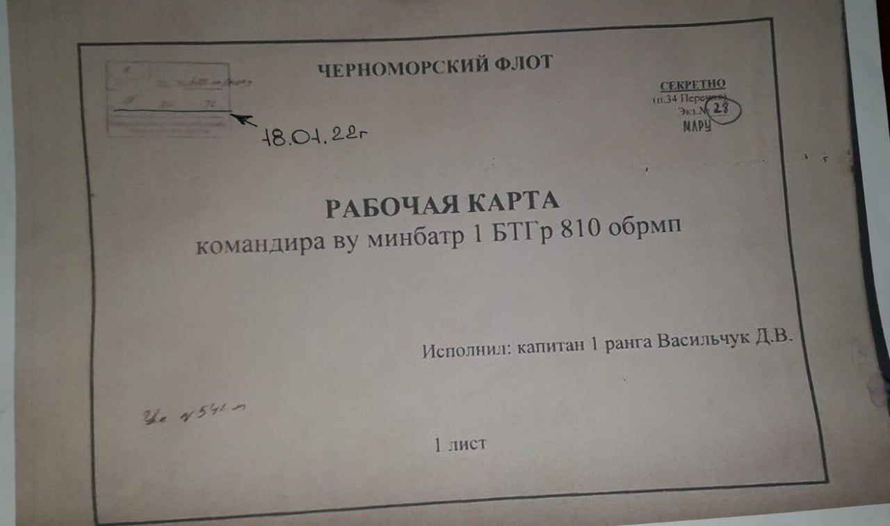 Так, у нашому розпорядженні опинилися планувальні документи одного з підрозділів батальйонної тактичної групи 810-ї окремої бригади морської піхоти Чорноморського Флоту Російської Федерації.