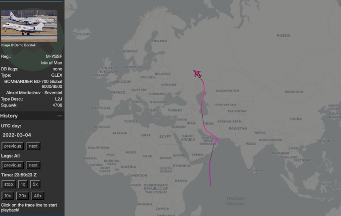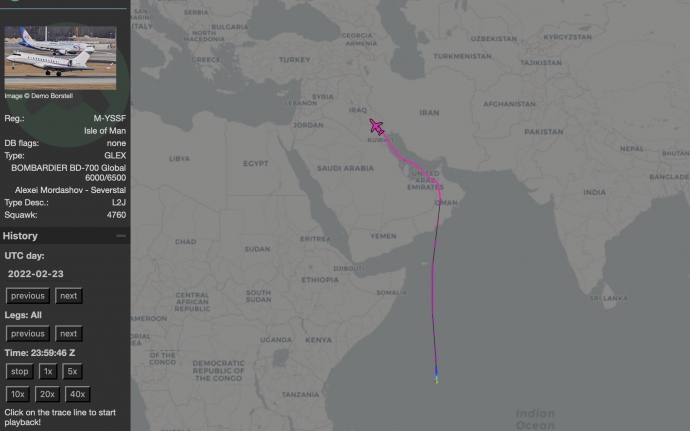 Літак Мордашова Bombardier Global 6000 23 лютого в переддень російського наступу на Україну вилетів з Сейшел до Москви.