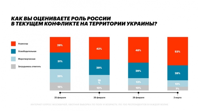 Так, щонайменше 53% людей вже вважають РФ агресором, тоді як початково таких було лише 29%.