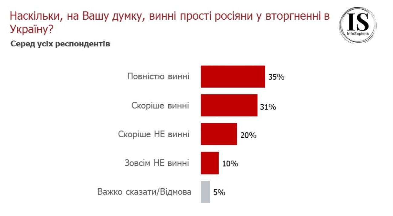 Також 66% українців вважають, що прості росіяни винні в збройній агресії, а 30% – що не винні.