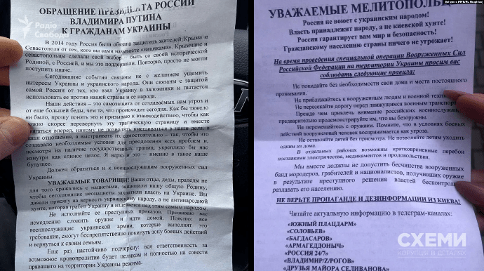 Деталі: В одній з листівок, яку роздавали мелітопольцям, начебто звернення президента Росії Володимира Путіна до українців, де тези про "самозахист Росії", "неонацистів" та заклик "до взаємодії". Стверджується, що "сьогоднішні події пов’язані не з бажанням обмежити інтереси України та українського народу", а "пов’язані із захистом самої Росії від тих, хто взяв Україну в заручники та намагається використати її проти нашої країни та її народу". Окремим рядком – начебто звернення російського президента до українських військовослужбовців: їх закликають "не виконувати злочинних наказів", а "скласти зброю та йти додому", обіцяючи "безперешкодне повернення додому".