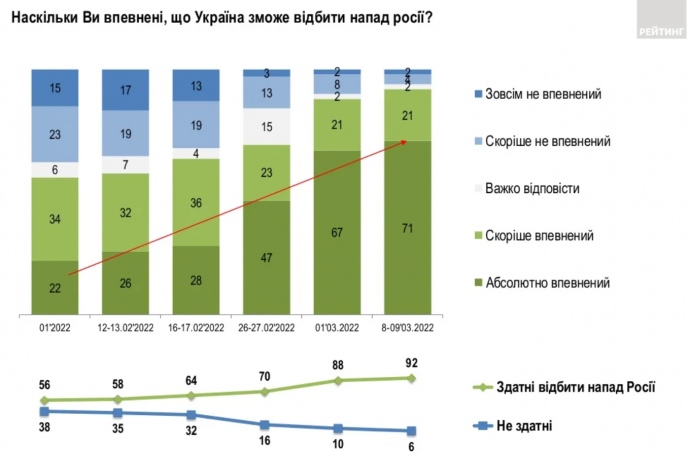 Дослівно: "92% опитаних вірять у те, що Україна зможе відбити напад Росії. Практично щодня цей показник зростає. Лише 6% сьогодні не мають такої впевненості. Віра у перемогу переважає в усіх регіонах країни".