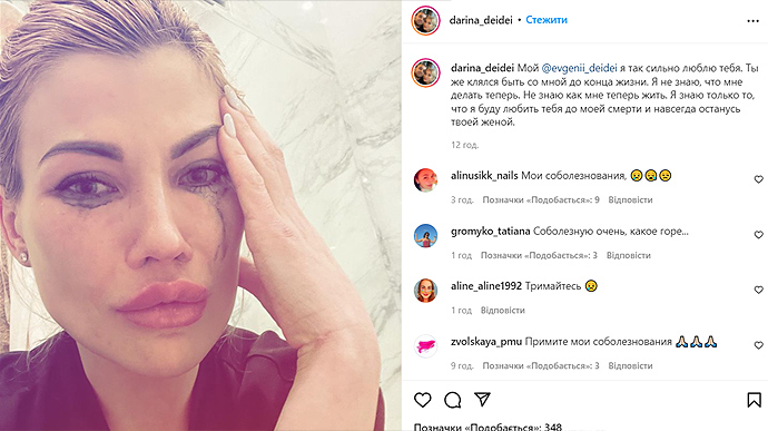 Пряма мова Дейдей: "Мій @evgenii_deidei я дуже люблю тебе. Ти ж присягався бути зі мною до кінця життя. Я не знаю, що робити тепер. Не знаю, як мені тепер жити. Я знаю тільки те, що я любитиму тебе до моєї смерті і назавжди залишуся твоєю дружиною".