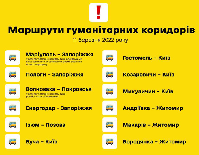 11 березня в Україні запрацюють 12 гуманітарних коридорів для евакуації з атакованих російськими військами населених пунктів у різних областях.