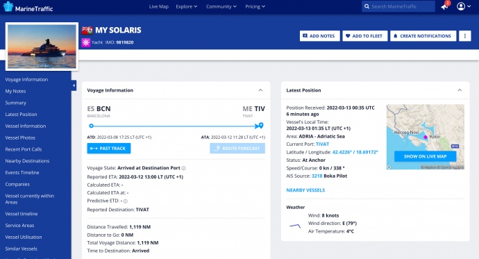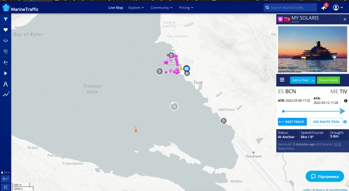 Російський олігарх Роман Абрамович рятує свої яхти від санкцій: 139-метрову яхту "Solaris" перегнали з іспанського порту Барселони в Тіват (Чорногорія), а яхту "Eclipse" вивели з Карибських островів.