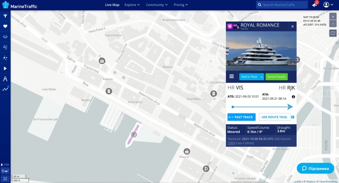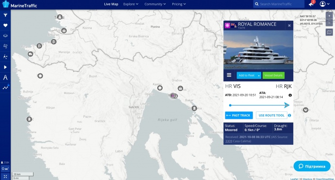 Деталі: Відповідно до даних трекінгового сервісу MarineTraffic, в останній раз ця яхта використовувалась 20 вересня 2021 року.