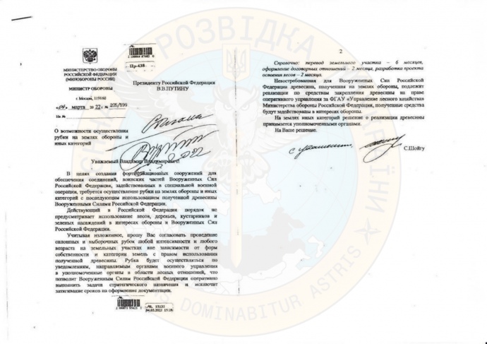 Держава окупант планує масові вирубки українських лісів, йдеться у листі міністра оборони Росії Сергія Шойгу "Про можливість вирубки на землях оборони", адресованому особисто президенту РФ Володимиру Путіну, копію якого має українська розвідка.