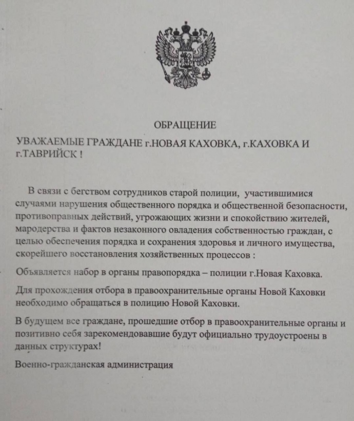 У Новій Каховці, Каховці та Таврійську російські окупанти схиляють місцевих ставати колаборантами — закликають вступати до лав їхньої поліції.