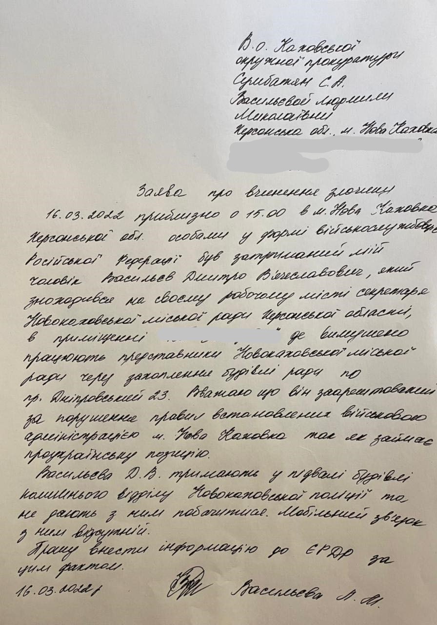 Пряма мова Васильєвої: "Секретар ради Новокаховської об’єднаної територіальної громади Васильєв Дмитро В’ячеславович уже понад дві доби захоплений й утримується в полоні російськими окупантами в підвалі (ізолятору тимчасового утримання) в приміщенні поліції м. Нова Каховка, яке використовується окупантами як "офіс" так званої "комендатури".