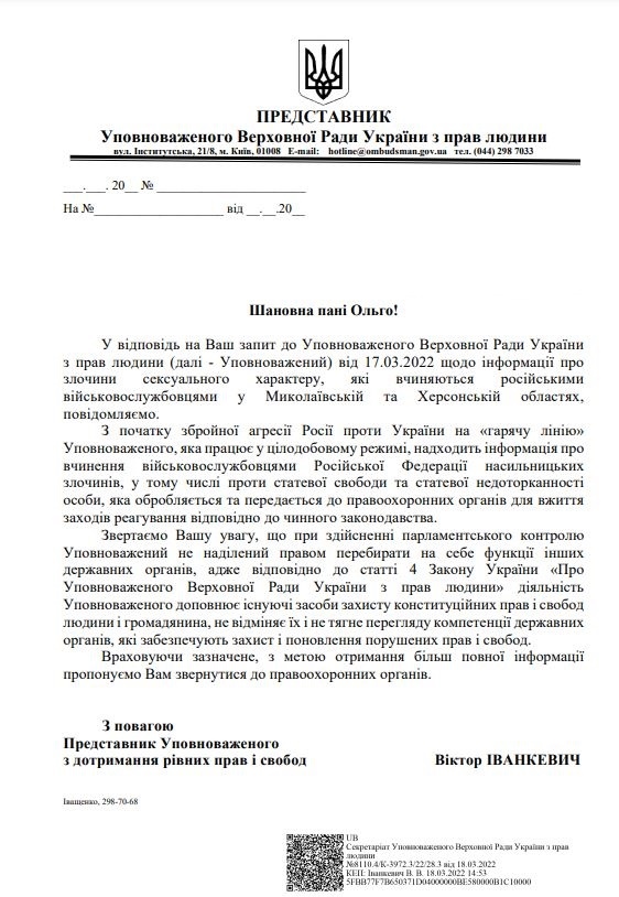 Дослівно: "З початку збройної агресії Росії проти України на "гарячу лінію" уповноваженого надходить інформація про вчинення військовослужбовцями Російської Федерації насильницьких злочинів, у тому числі проти статевої свободи та статевої недоторканості особи".