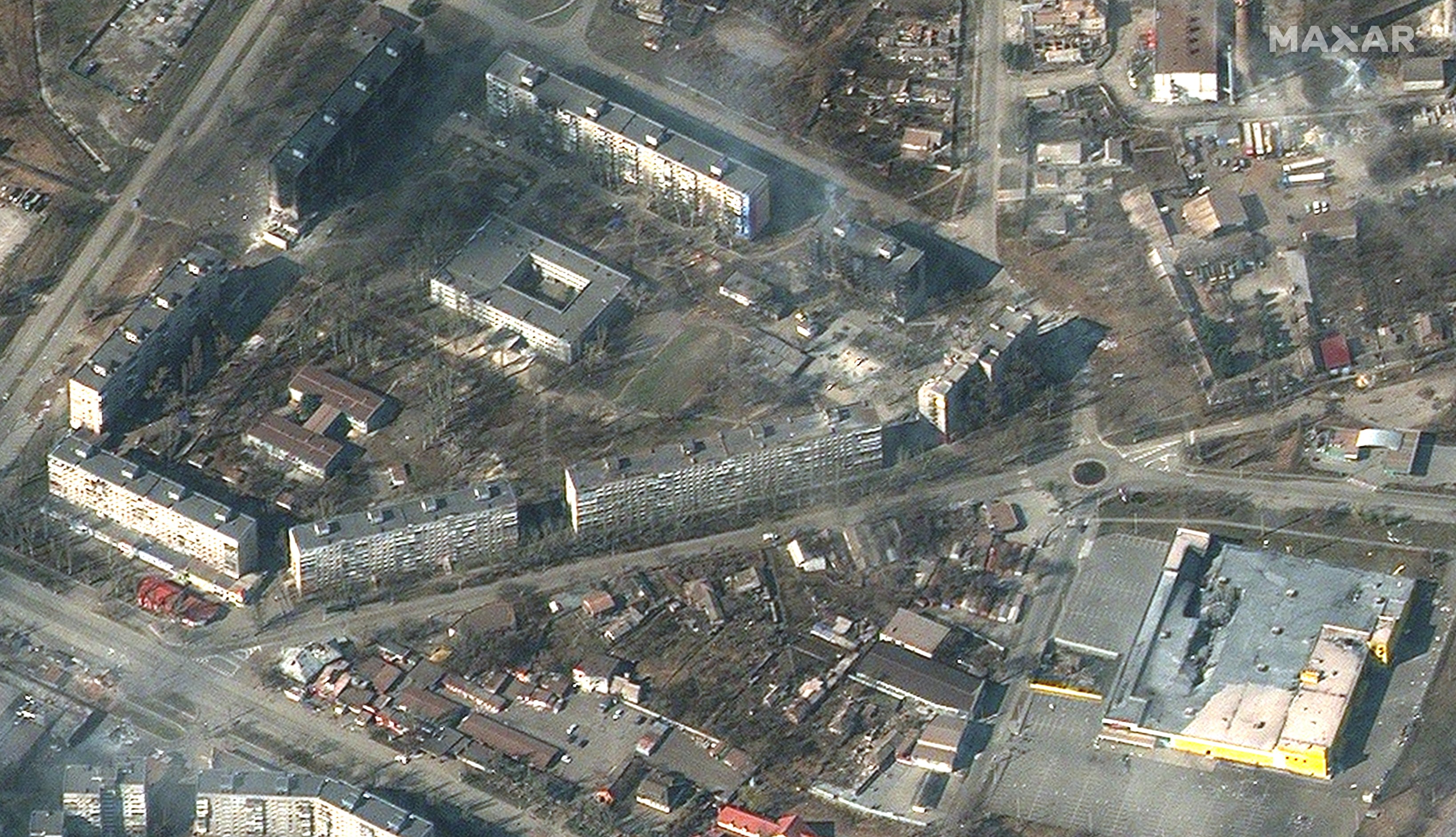 Спалені будинки й знищений ТРЦ: фото Маріуполя з супутника і відео з дрона