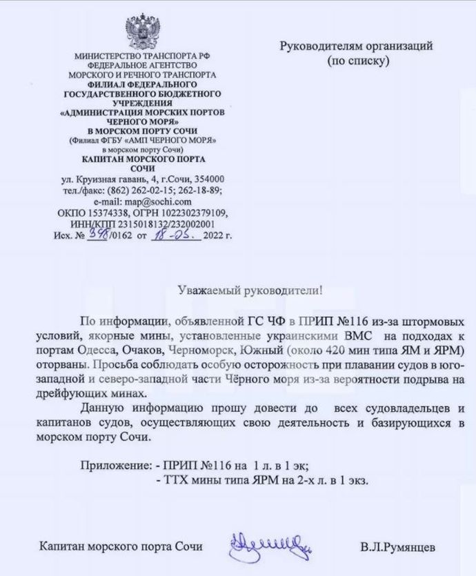 Деталі: Клименко оприлюднив документ від 18 березня за підписом капітана морського порту Сочі В‘ячеслава Румянцева, у якому стверджується, що українські ВМС встановили якірні міни на підходах до своїх портів Одеса, Очаків, Чорноморськ і Южне – але через шторм вони відірвалися і зараз становлять загрозу для судноплавства у північно-західній частині Чорного моря.
