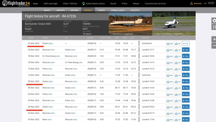 Загалом за час повномасштабного вторгнення Росії до України літак вже втретє відвідує Дубай. Попереднього разу він літав туди на 8 березня. А перед тим – третього березня: