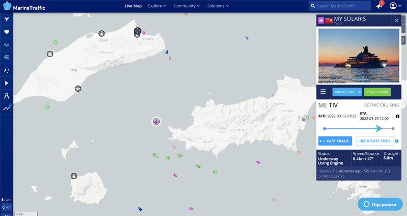 В той же час видання Reuters повідомило, що 21 березня до Туреччини прийшла й друга яхта Абрамовича Solaris, яку раніше вдалося врятувати від санкцій, перегнавши з порту Барселони до Чорногорії. Саме з Чорногорії вона і прийшла до турецького курорту Дача.