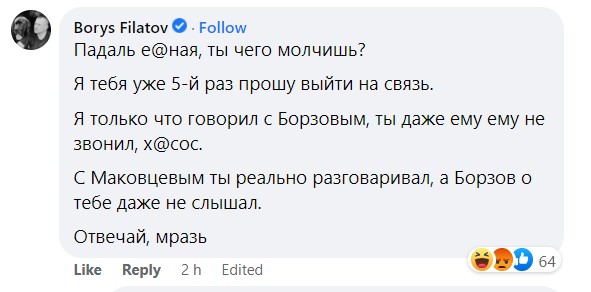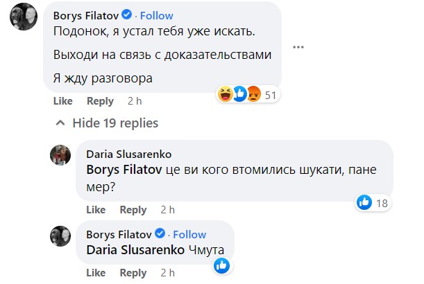Згодом Філатов залишив ще один лайливий коментар, сказавши, що Чмут уникає розмови з ним та Борзовим. За його словами, Чмут впродовж 5 годин не відповідає на телефонні дзвінки, хоча від моменту публікації Чмутом допису до коментаря Філатова минуло 2 години.
