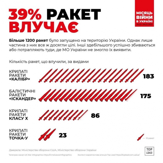 Деталі: Згідно зі статистикою, наведеною у відео МОУ, станом на 24 березня ворог випустив по території України 175 балістичних ракет типу "Іскандер", 183 - "Калібр", 86 крилатих ракет класу Х та 23 балістичні ракети з комплексів "Точка У".