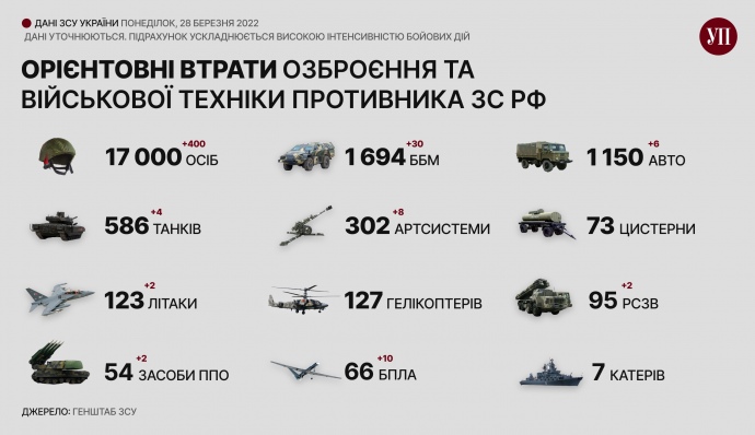 Деталі: Загальні бойові втрати противника з 24.02 по 28.03 орієнтовно склали: