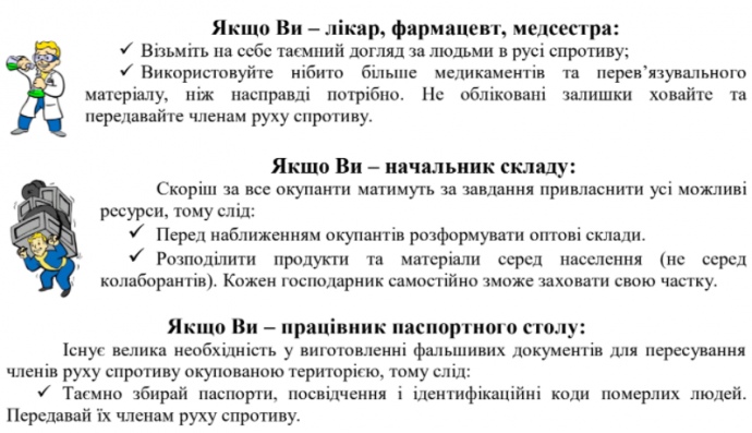 Деталі: Також є рекомендації для чиновників, які обіймають керівні посади при адміністрації окупаційної влади, поліцейських, медиків, вчителів, начальників складів, священників і працівників паспортного столів.