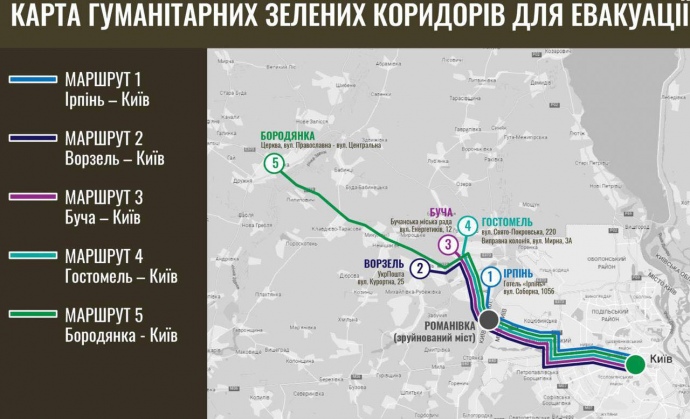 Україна та Російська Федерація погодили припинення вогню з 9:00 до 21:00 для евакуації населення шістьма гуманітарними коридорами.