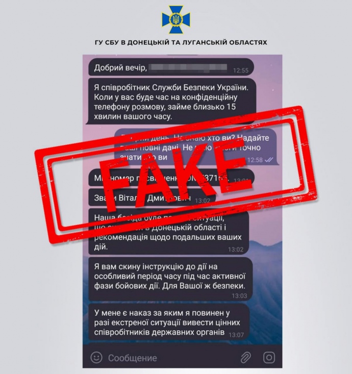 Пряма мова: "Увага! Черговий ворожий фейк! Ворог від імені співробітника СБУ надсилає повідомлення з вірусним файлом до працівників державного сектору Донецької області. У листуванні окупанти спонукають завантажити файл з начебто інструкцією дій на період воєнного часу.