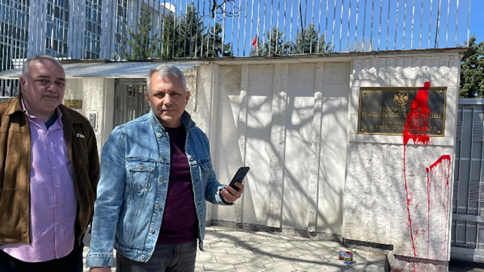 Лідери болгарської опозиційної партії "Ми йдемо" облили стіну посольства РФ червоною фарбою.
