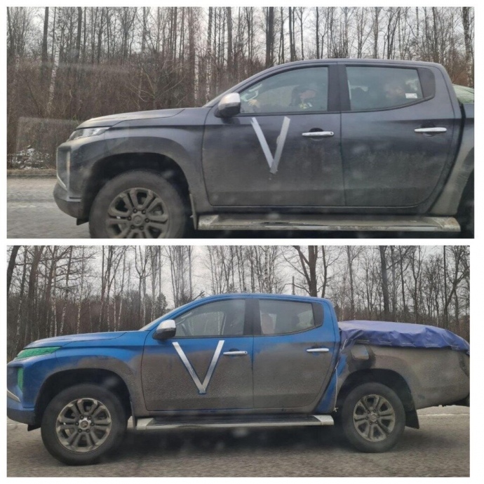 Деталі: Білоруські журналісти отримали від очевидців чималу кількість фото та відеозаписів, як на дорогах Білорусі роз’їжджають автомобілі без номерних знаків, але з маркуванням літерою V на боках, бампері тощо.