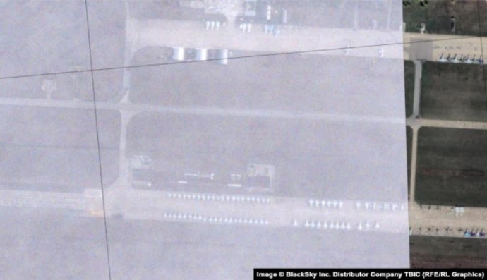 Відповідно до супутникового знімку за 11 квітня, російські військові літаки розташовані одразу на двох паркувальних майданчиках.