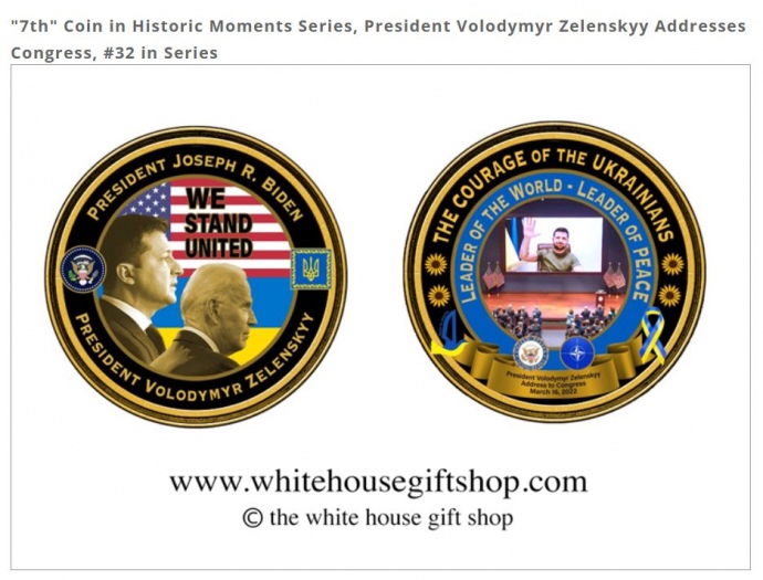Дослівно Верховна Рада: "Білий дім у сувенірному магазині презентував пам'ятну монету, присвячену історичному зверненню Володимира Зеленського до Конгресу США 7 березня 2022 року.