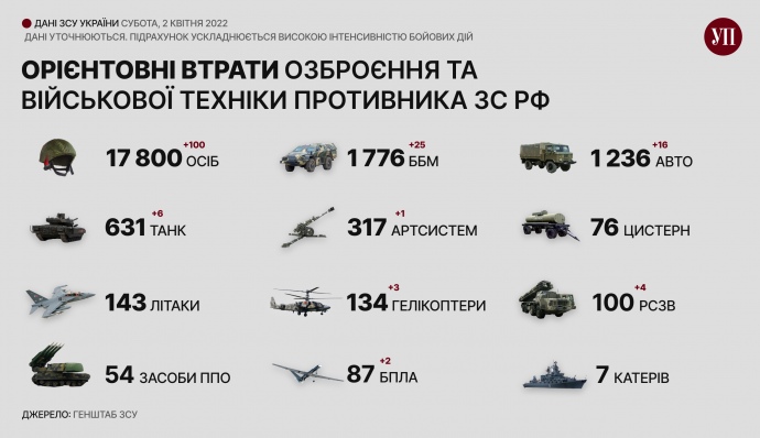 Деталі: Загальні бойові втрати противника з 24.02 по 02.04 орієнтовно склали: