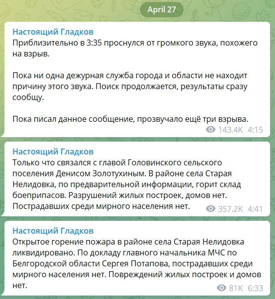 Губернатор Бєлгородської області РФ В'ячеслав Гладков повідомив, що, за попередніми даними, в районі села Стара Нєлідовка горить склад боєприпасів.