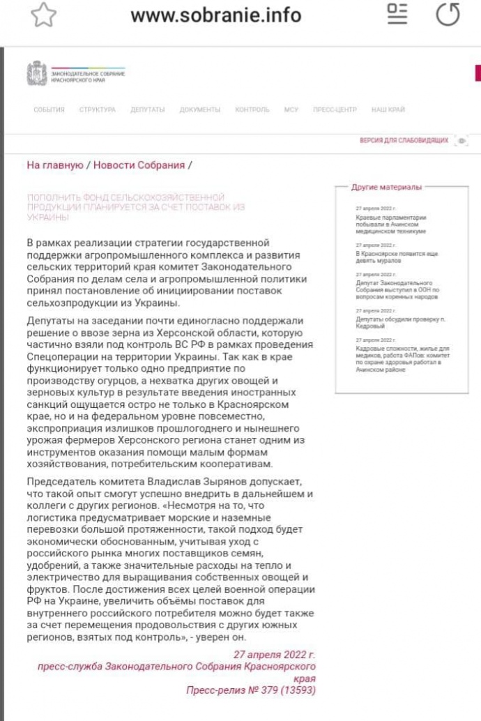 У російському Красноярському краї вирішили поповнити власний фонд сільськогосподарської продукції за рахунок незаконних поставок з окупованих територій України.