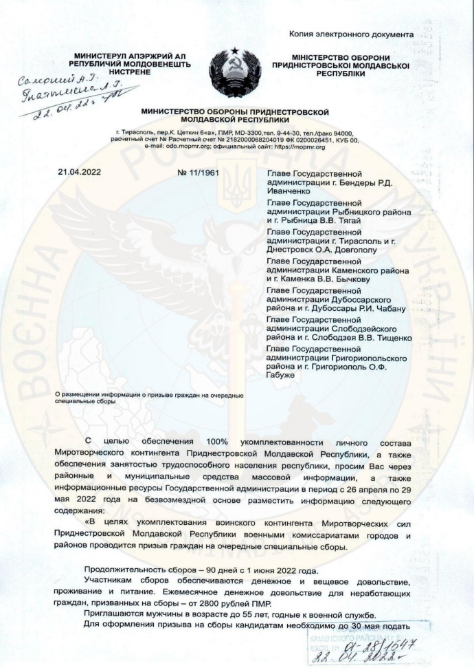 У листі "Міністерства оборони ПМР" до голів місцевих адміністрацій, який отримало Головне управління розвідки, розкривається інформація щодо проведення призову громадян на "спеціальні збори".