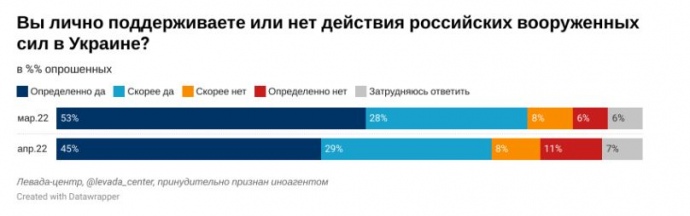Станом на кінець квітня 2022 року військові дії Росії, яка напала на Україну, підтримують 74% росіян.