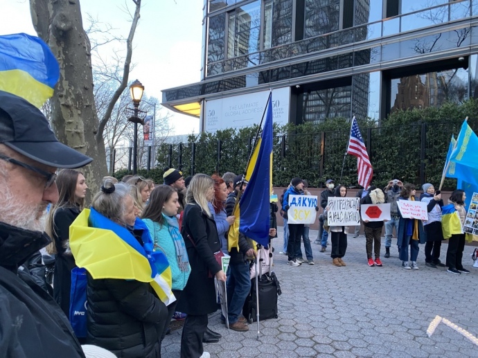 Деталі: Люди з синьо-жовтими прапорами та гаслами зібралися на Мангеттені біля штаб-квартири ООН, аби висловити свою підтримку Збройним Силам України.